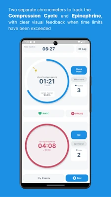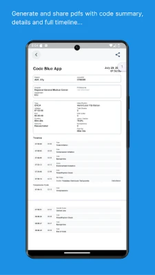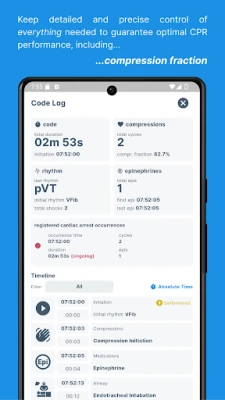 Code Blue CPR Timer was developed and extensively tested to provide crucial information in a precise and intuitive manner, assisting one of the most stressful and time critical occurrences in the healthcare setting. The timer layout was meticulously designed to track and register important events (e.g., initial cardiac arrest rhythm, pulse/rhythm check, medications, procedures, etc), with two separate chronometers that allow monitoring both CPR compression cycles and epinephrine doses simultaneously.