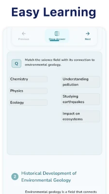 Gain a deep understanding of environmental geology with this comprehensive learning app designed for students, geologists, and environmental professionals. Covering key topics like natural hazards, resource management, and environmental protection, this app offers detailed explanations, interactive exercises, and practical insights to help you excel in environmental studies.